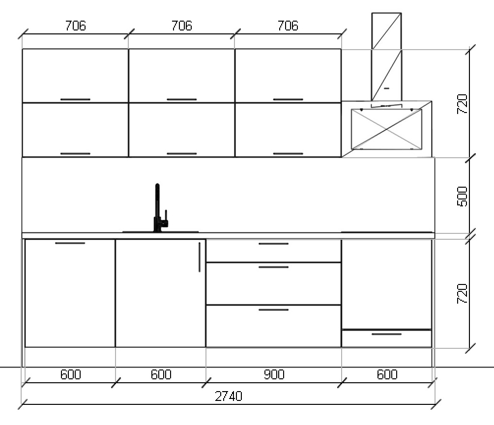 Celková délka kuchyně 2740 mm, výška pracovní plochy 870 mm až 910 mm
