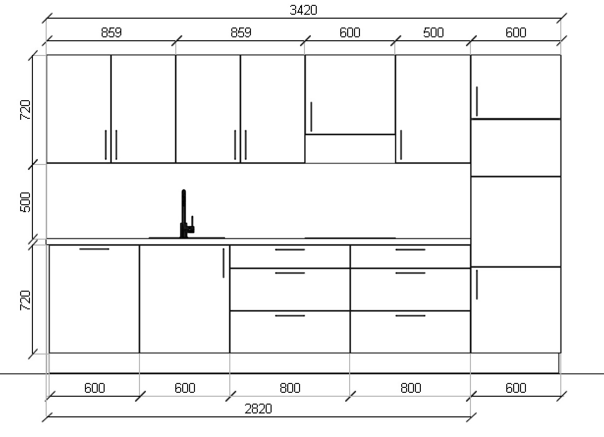 Celková délka kuchyně 3420 mm, výška pracovní plochy 870 mm až 910 mm