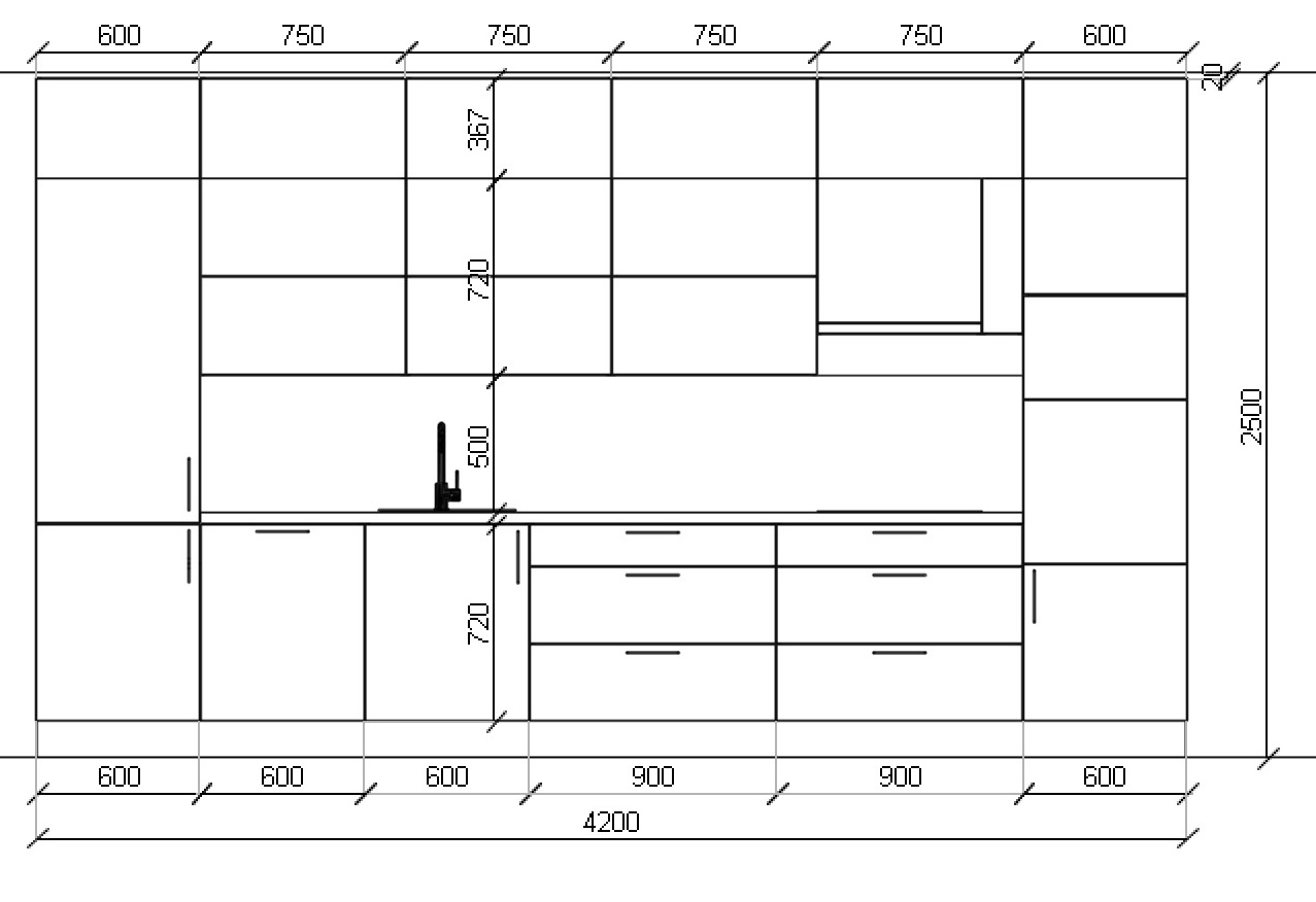 Celková délka kuchyně 4200 mm, výška pracovní plochy 870 mm až 910 mm